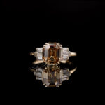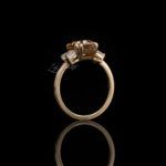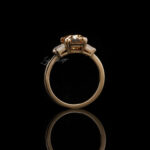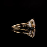 Infused with Edwardian detail, Rosalind presents a 2.7 CT Old Mine Emerald Moissanite in champagne with DEF Baguette accents in a 1.9mm customizable band.