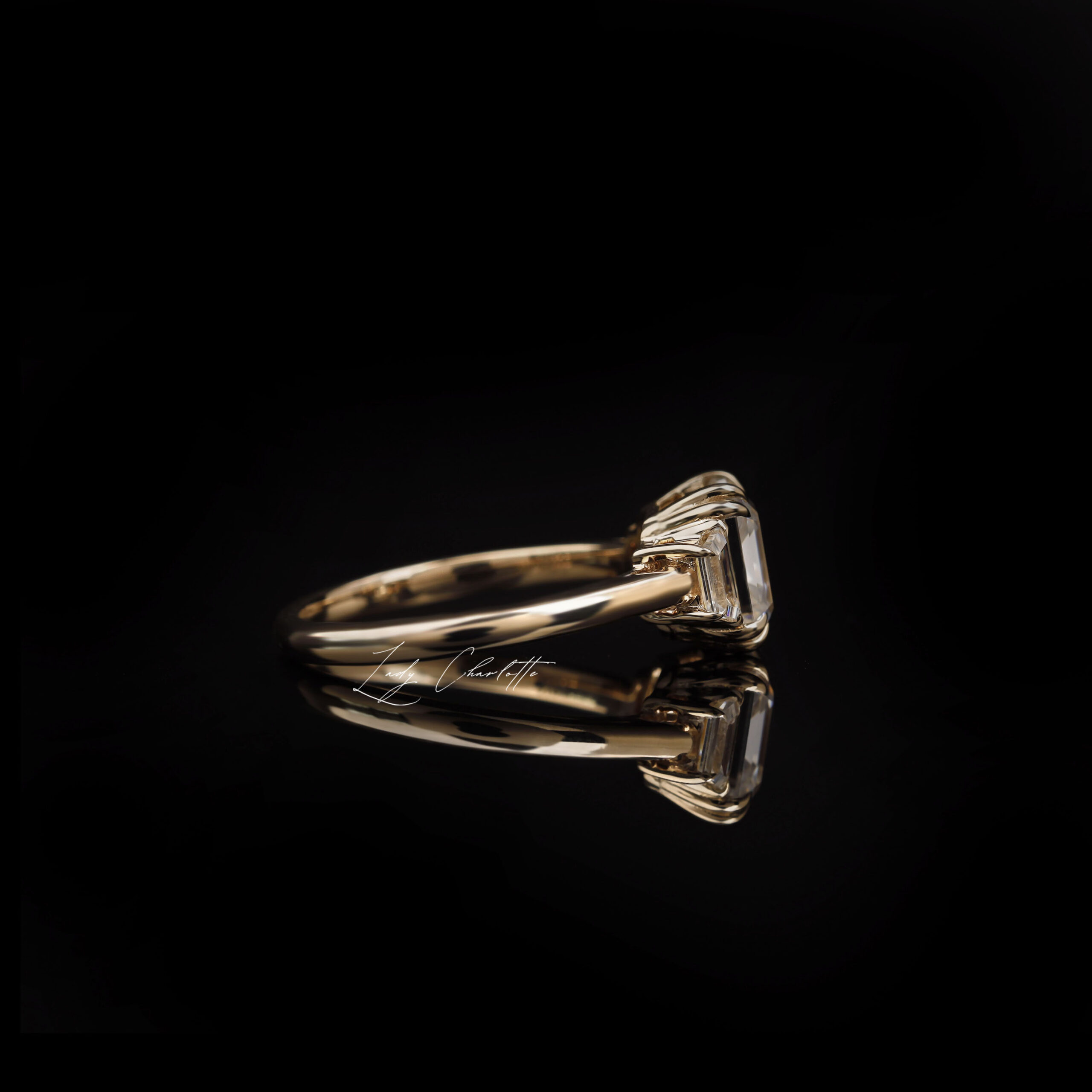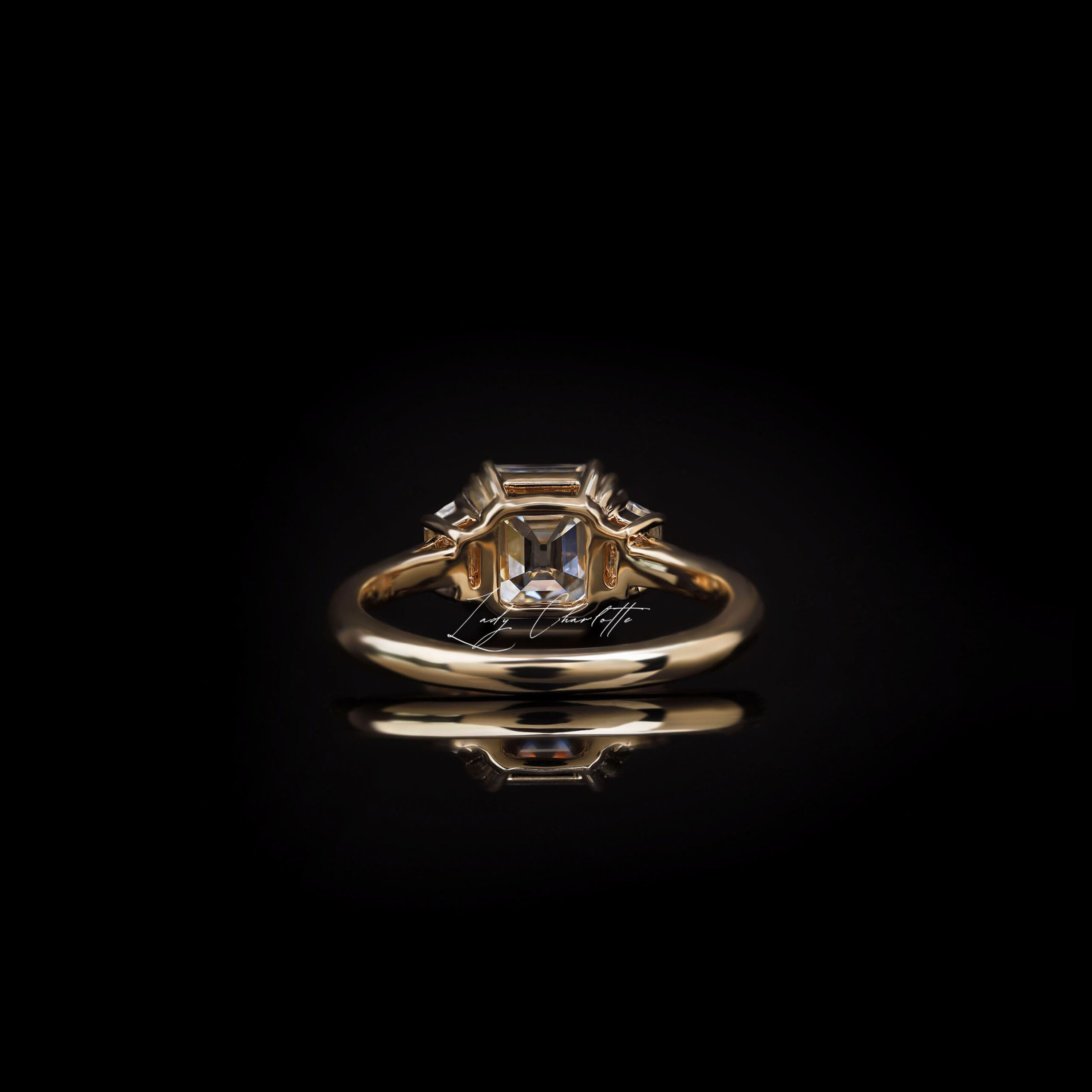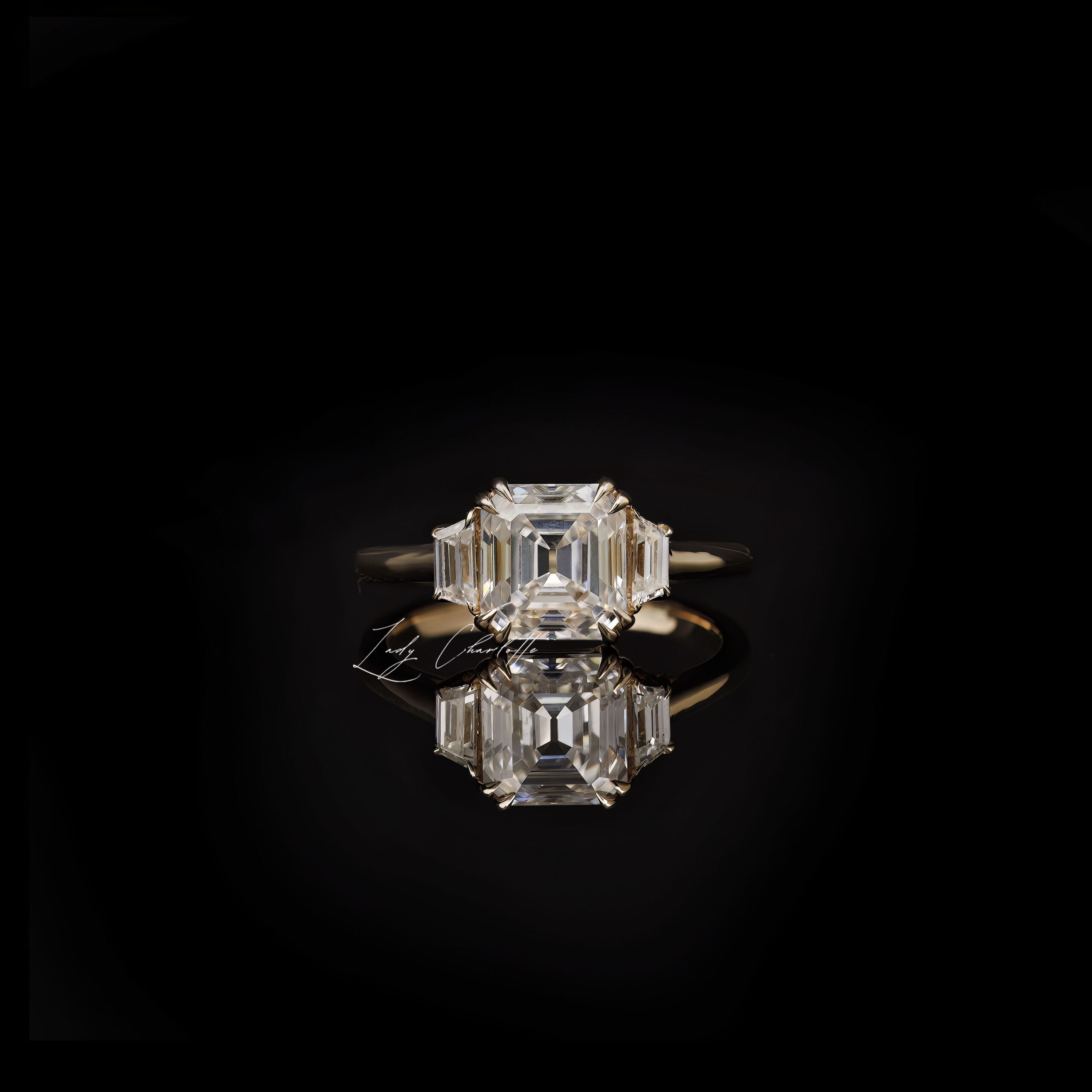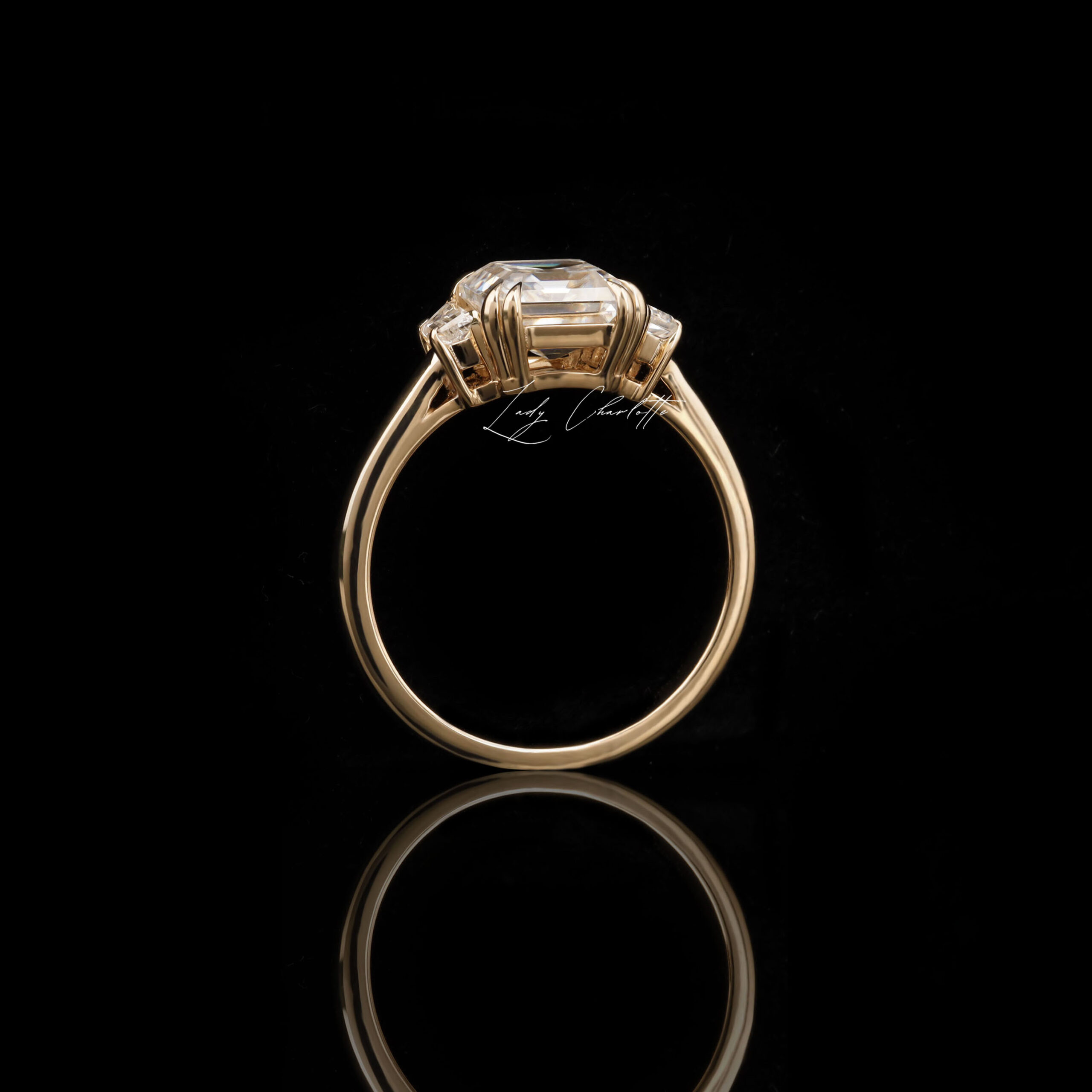 Flairing with asscher elegance, Beatrice captivates a 1.99 CT Old Mine Asscher DEF Moissanite with 0.24 CT trapezoid accents in a 2.1mm customizable band.
